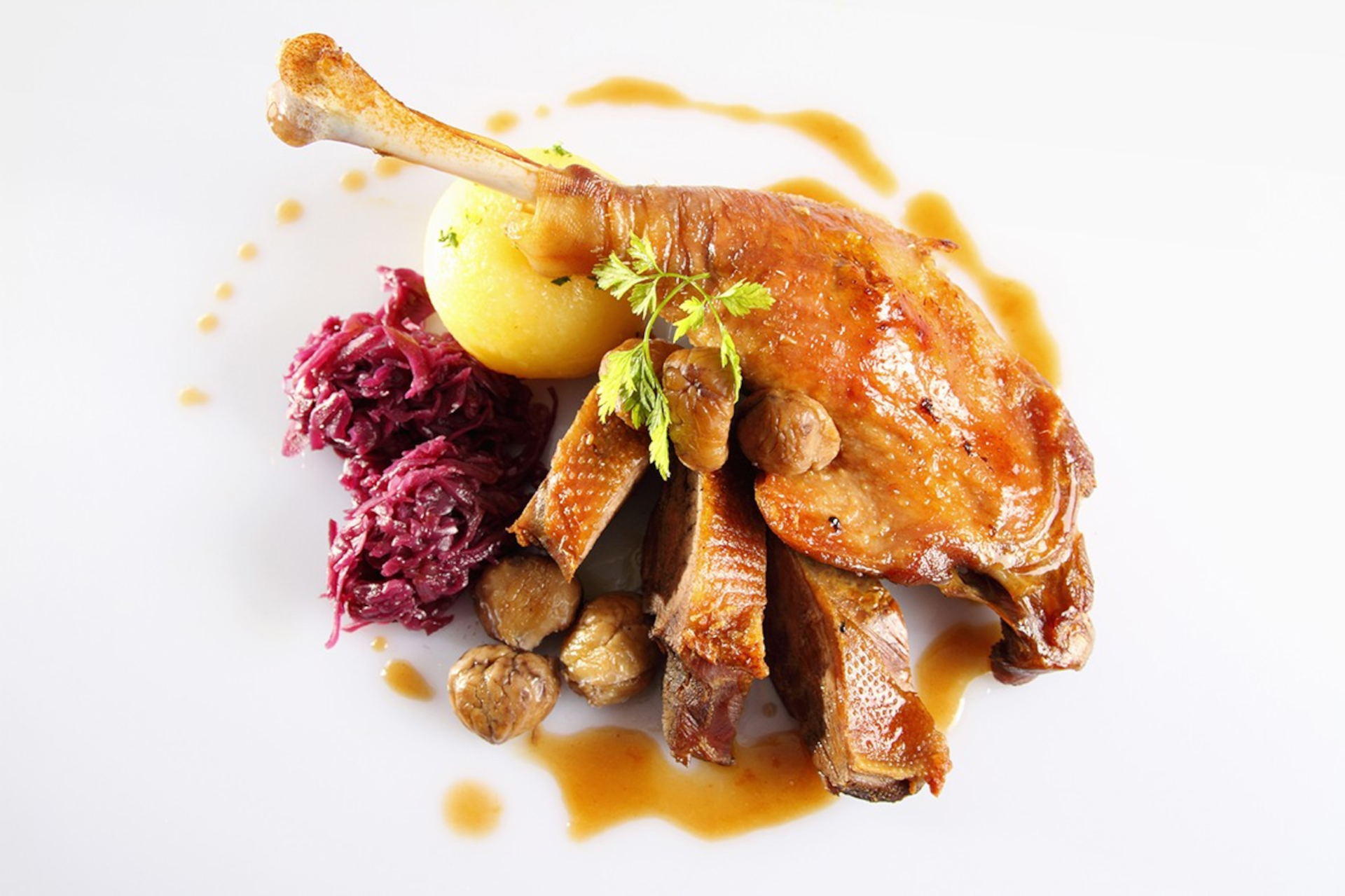 Breast and leg of Oldenburg goose, served with red cabbage, dumplings and rich jus
